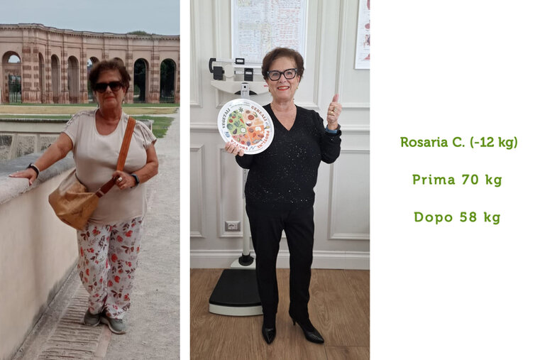 Oggi Rosaria con 12 kg in meno si sente rinata, è migliorata la sua pressione e tutti i valori del sangue sono tornati ai parametri ottimali, ha così riacquisito forza, leggerezza e vitalità!